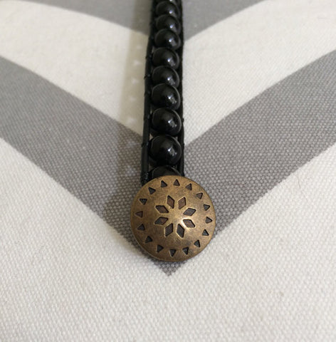 Men's single-wrap bracelet with bronze button. Has black leather, black beads, and a bronze, brass button enclosure. Also available with brown leather. All orders are customizable so if you'd like different color leather or different colored beads or button, just message me with your custom order!